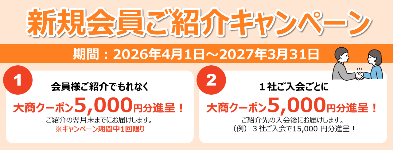 | 特典② | 「1社ご入会」ごとに 大商クーポン5,000円分進呈 (進呈上限なし!) |