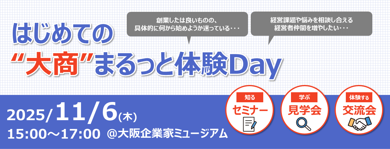 大阪商工会議所では、創業後間もない企業経営者の方々を対象に、大商の取り組みを知っていただき、今後お気軽にご利用いただくため、「ビギナーズセミナー」「大阪企業家ミュージアムの見学」「名刺交換会」がセットになったお試しイベントを開催します。